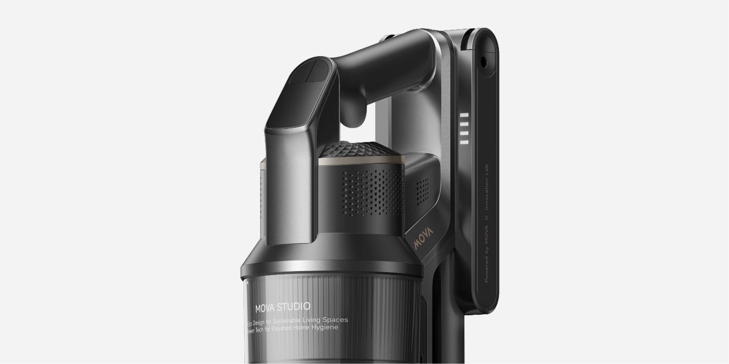 Fino a 90 minuti di pulizia*. Lo schermo OLED mostra le modalità e la durata della batteria. Passa alle modalità Minima/Media/Massima con un solo pulsante o tieni premuto due secondi per la modalità Auto, che regola l'aspirazione in base ai livelli di sporco.
