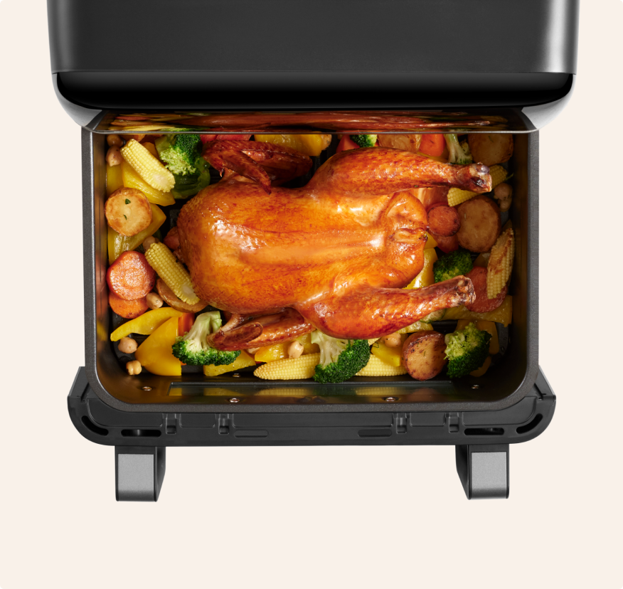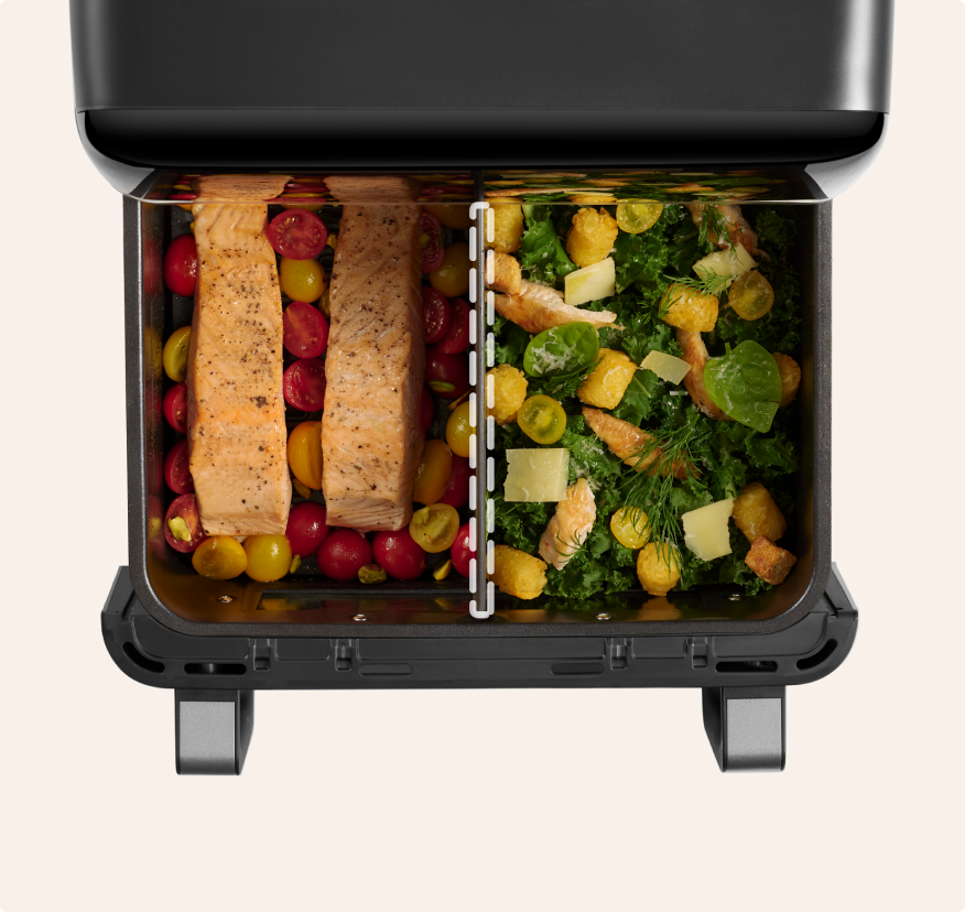Il cestello FlexZone™ si trasforma da uno spazioso megavano da 9 L a due zone di cottura separate per evitare che gli aromi si mescolino tra i piatti.