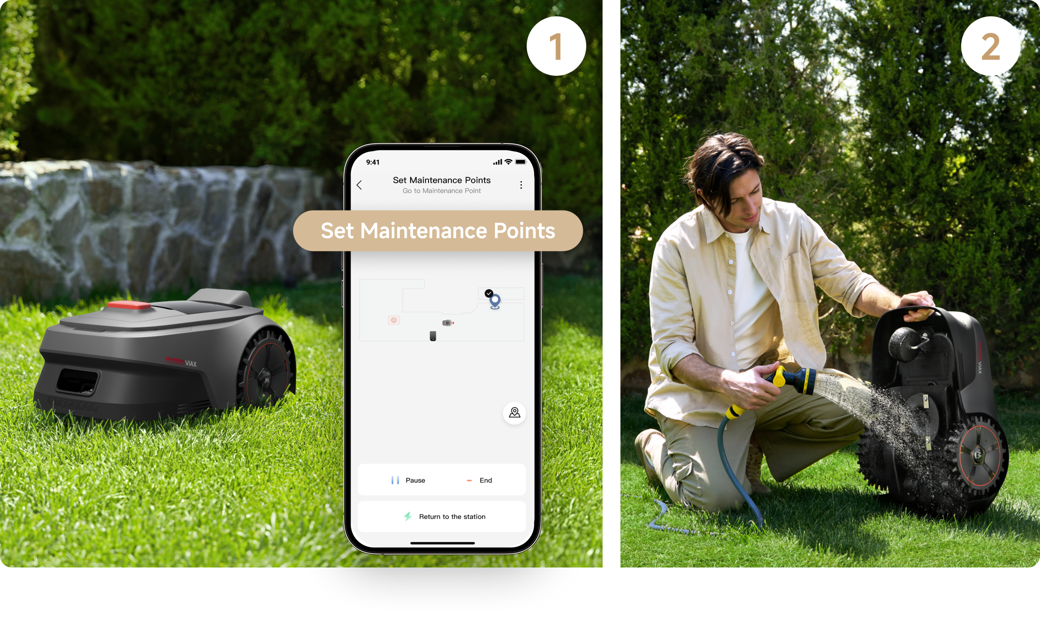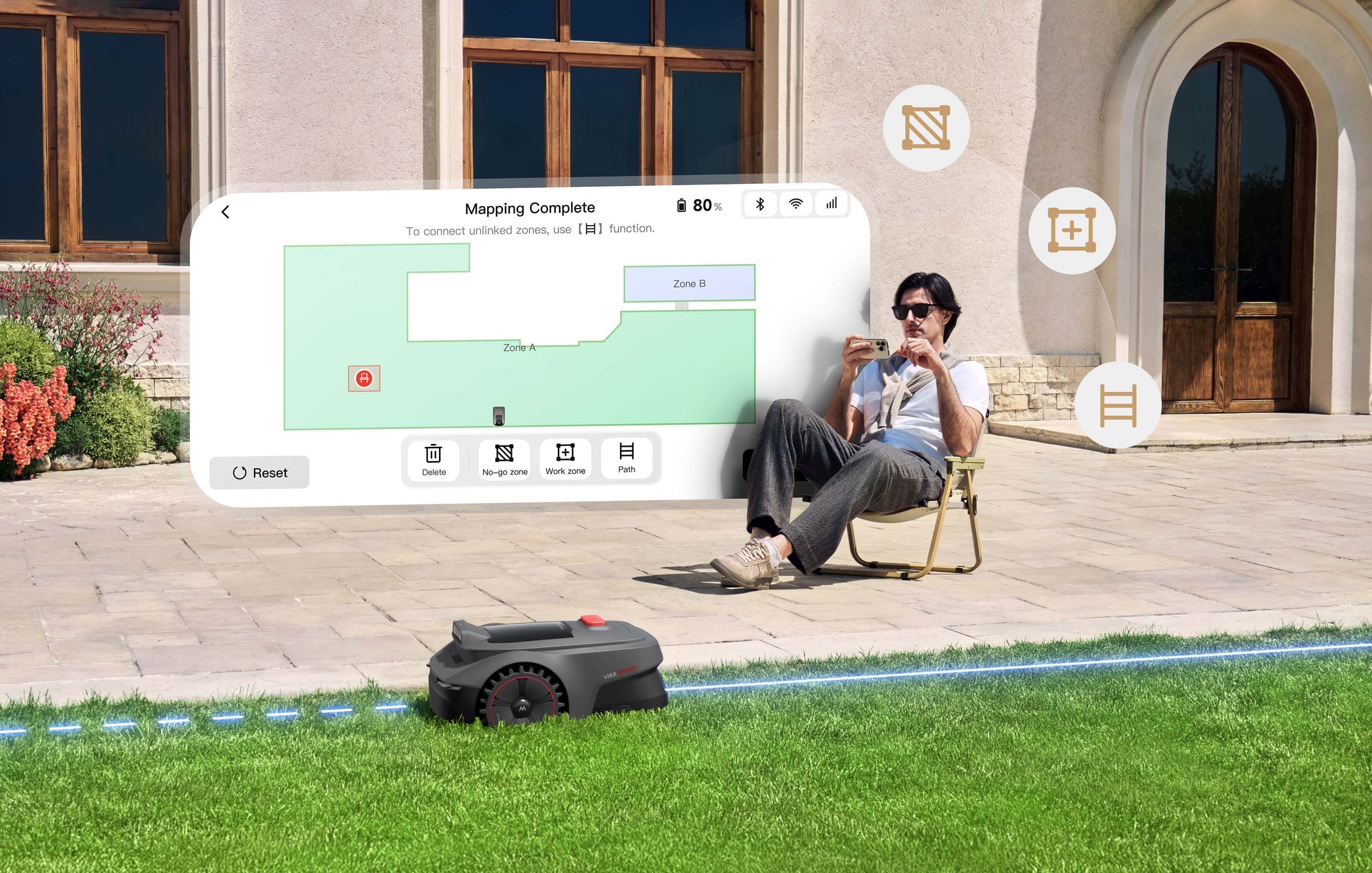 Collega semplicemente il robot tagliaerba al tuo telefono e imposta confini virtuali per più zone di taglio, definisci aree vietate e crea percorsi tra le sezioni — tutto con pochi tocchi nell’app MOVAhome.